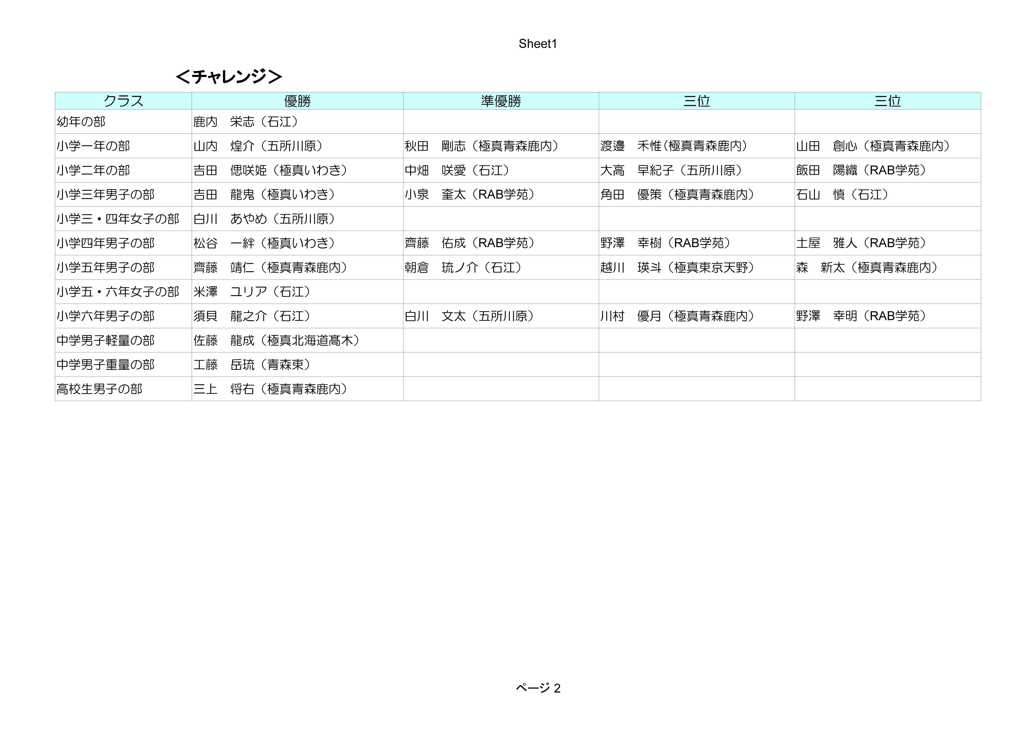 <幼年>優勝 鹿内栄志 準優勝 工藤麗愛 三位 大高行将